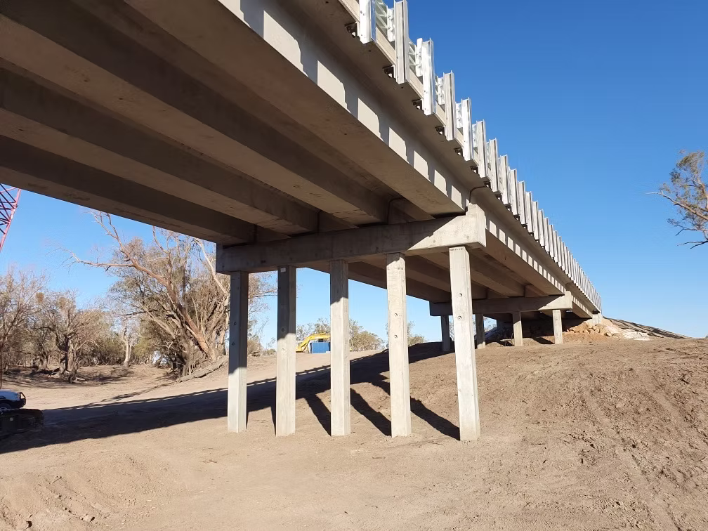 High-capacity infrastructure for regional access. Completed for Brewarrina Shire Council, this project replaced a timber structure near Goodooga with a 100m-long, two-lane bridge. Murray Constructions managed full delivery of the six-span crossing, incorporating precast components, traffic management, and environmental protection measures throughout construction.